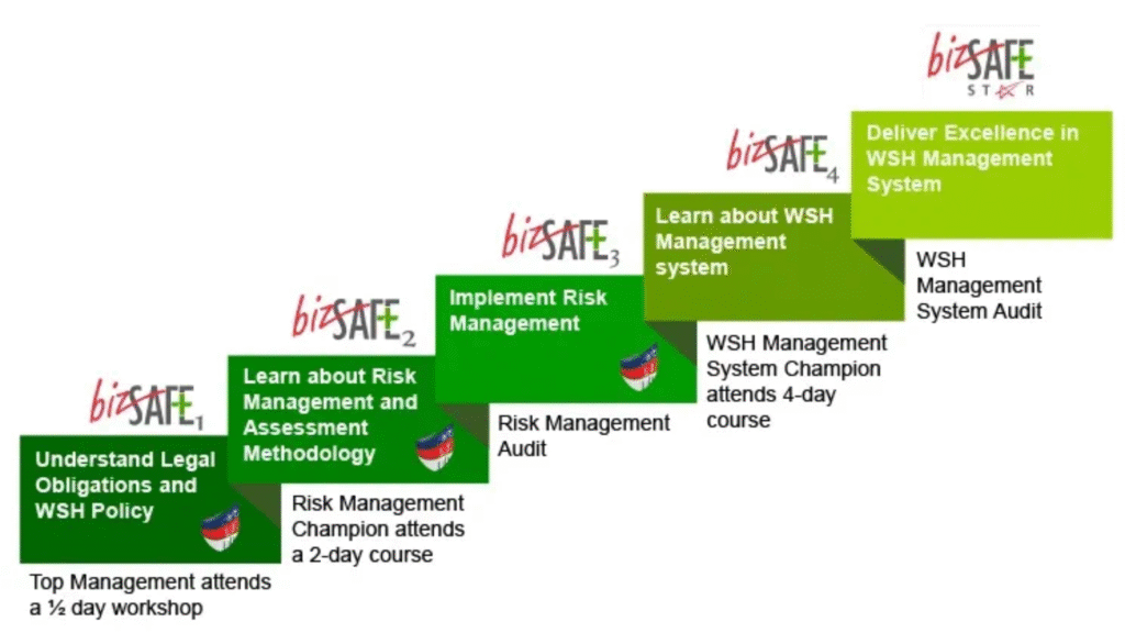 BizSAFE Level 3 is the stage in Singapore’s national workplace safety programme where a company moves beyond leadership commitment and training, and demonstrates that it has actually implemented a structured approach to managing workplace risks.
