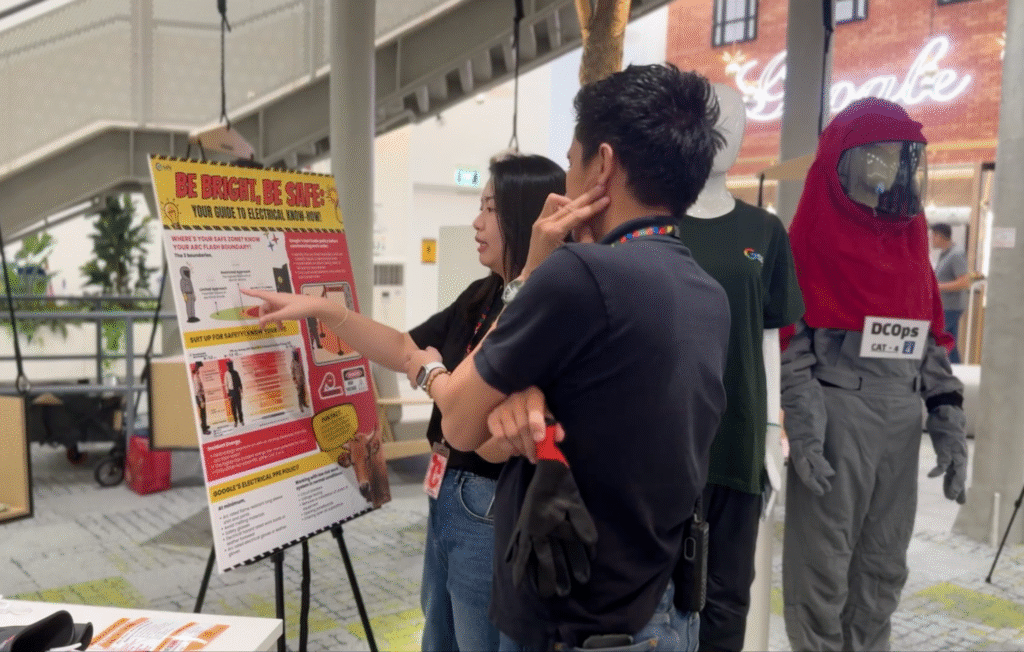 Participants learned the importance of understanding arc flash boundaries and choosing the right PPE. They explored how heat energy varies with distance and examined a Category 4 PPE suit up close. The session reinforced Google’s PPE policy and the need for flame-resistant, arc-rated protection.